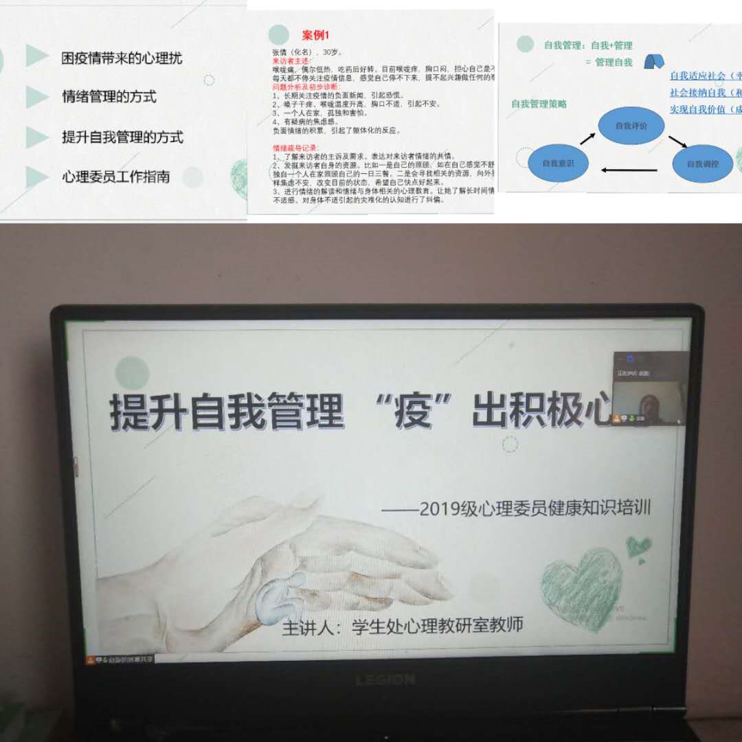 此次培训以疫情为背景,通过真实的案例、流畅易懂的语言将心理知识讲给同学们。通过本次培训心理委员明确了自己的工作的方式与方法,同学们知晓了调节自我情绪的方式方法并在网络平台中对牛跃老师和赵璇老师的工作表示感谢。