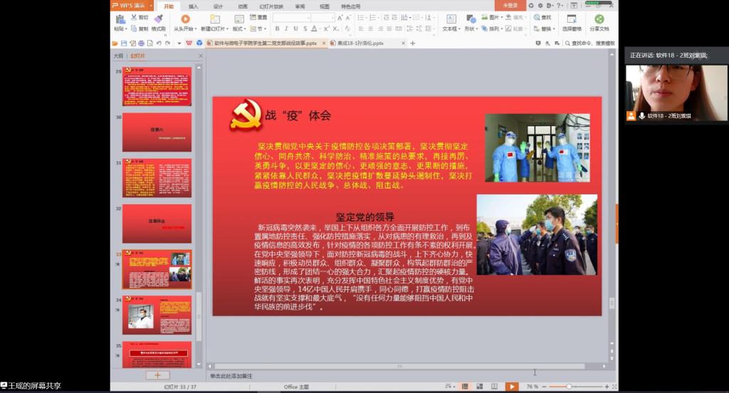 为庆祝中国共产党成立99周年,回顾党的光辉历程,讴歌建党、新中国成立以来取得的伟大成就,激发学生党员爱党、爱国、爱校的热情,构建和谐、向上的校园文化氛围;同时,借此机会,我们向这场疫情防控狙击战的最美逆行者致敬,讲述他们的战役故事。依照我校党委的相关工作部署,软件与微电子学院学生第二党支部于6月30日上午开展以《喜迎党的生日 回顾战役故事 守望初心使命》为主题的线上“战役”故事组织生活会。
