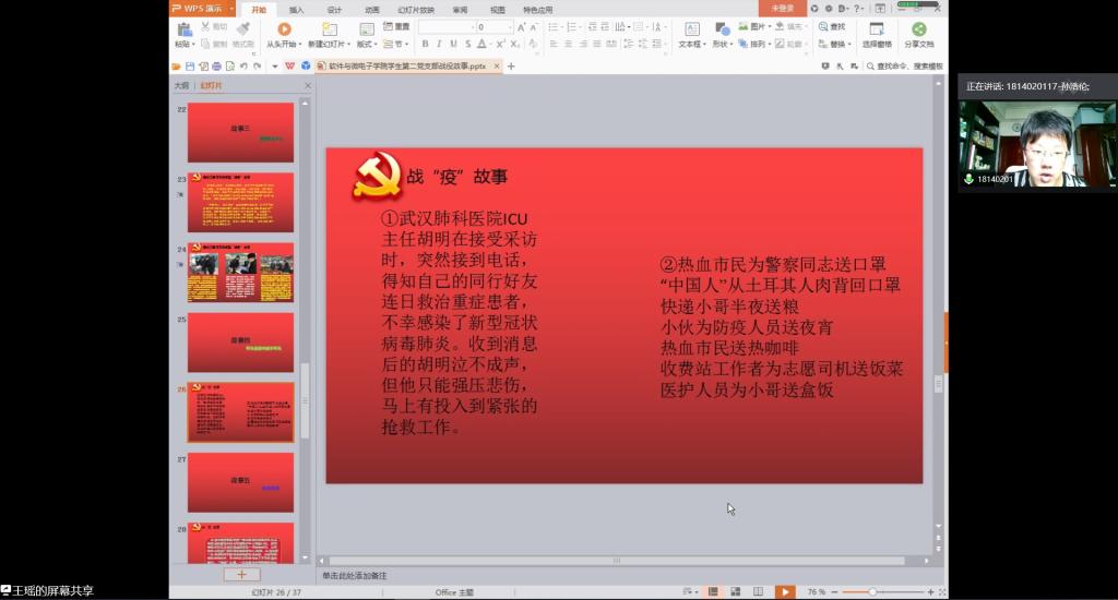 学生第二党支部书记王冰老师首先向最美逆行者致敬,己亥末,庚子春,新型冠状病毒感染的肺炎疫情牵动着无数国人的心。这不仅是对我国治理体系和能力的一次大考,更是对中华民族民族意志和民族精神的一次严峻考验。在这样的历史节点上,无数的英雄为了这场战役无声的斗争,有的甚至牺牲了宝贵的生命。接下来,王冰老师引出主题为“回顾战役故事 守望初心使命”故事交流会,学生第二党支部成员纷纷分享“战役”故事。