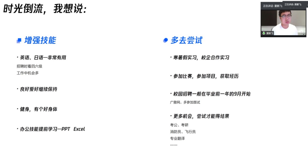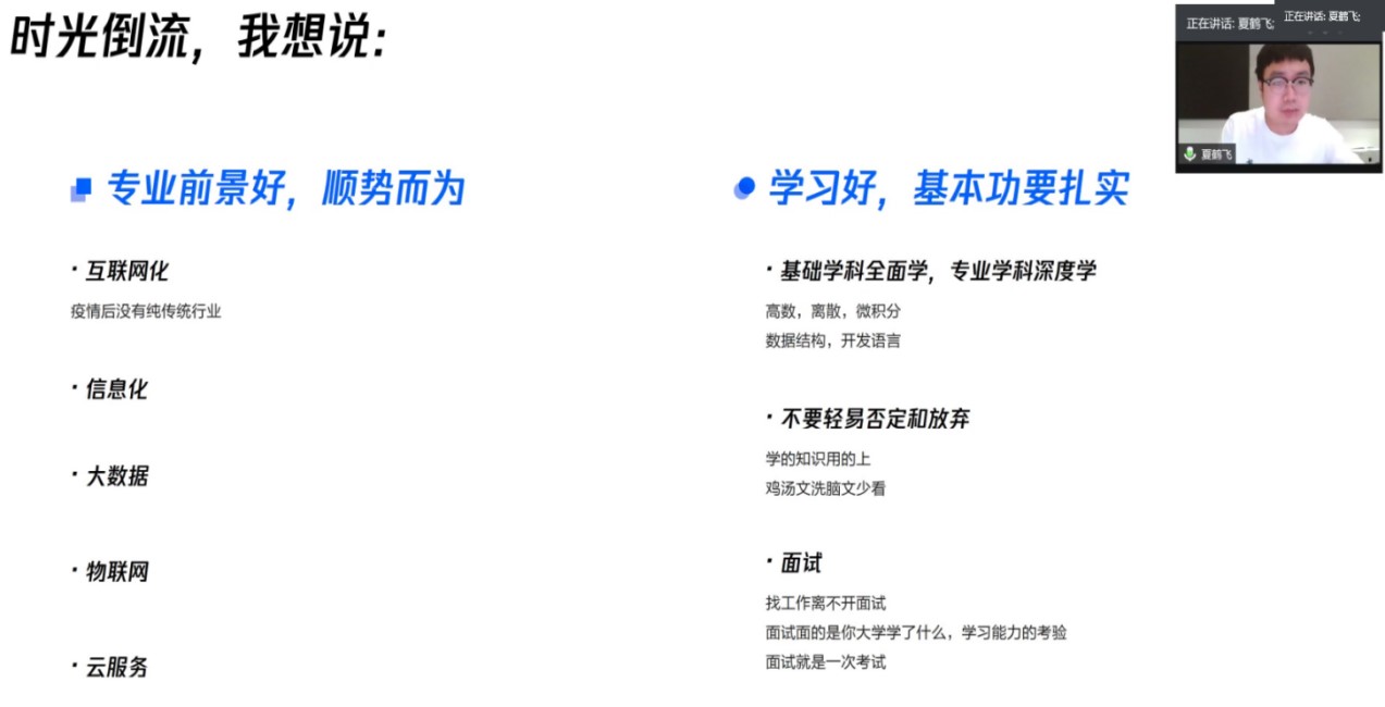 最后,夏鹤飞表示,“如果时光倒流”,他想说:在校期间应学好课内知识,并对专业知识加强学习,在校期间的知识是就业时的基本功。想要找到理想的工作,基本功一定要扎实,并且在校期间应多去尝试,敢于并乐于接受挑战,多次尝试、增强技能;在此主题期间谈到“如果时光倒流,还会选择现在的这一职业吗”的话题,夏鹤飞学长坚决地表示还会从事这一职业,并且很感激在校期间的教师及帮助过自己的同学,如今仍对母校怀着一颗感恩的心。