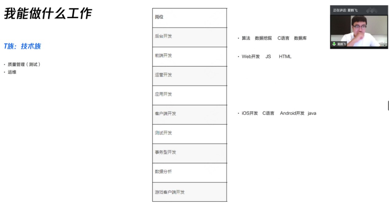 首先,夏鹤飞对不同行业进行介绍,为我们展示了毕业后可能的就业方向,总结出工作岗位中的“TPMDS”五大类:T族为技术族,需要熟练掌握算法,数据库,web开发等技能的后台工作;P族是关于产品项目,包括产品运营,产品功能等。M族是售前和市场类,相关工作是销售架构师等。帮助在校学生深入了解毕业后的就业方向:纯互联网,传统软件公司,运营商以及其他类。纯互联网中有许多我们熟悉的名企像腾讯、字节跳动等;同时还介绍了互联网和传统软件的区别:最直观的就是软件产品更新迭代的速度慢,互联网比较敏捷,更新速度快。