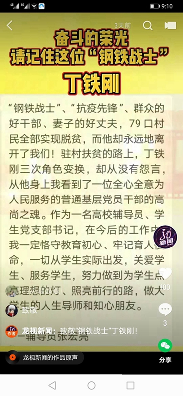8月21日,黑龙江龙视新闻在快手平台发布了“奋斗的荣光——请记住这位‘钢铁战士’丁铁刚”视频节目,报道了此次先进事迹宣讲会网络累计观看量达到31万人次,累计点赞140万,累计评论超过100万条,其中我校建筑工程学院辅导员张宏亮的3条留言成功入选省委宣传部精选的优秀留言,并在本次视频节目中展示。