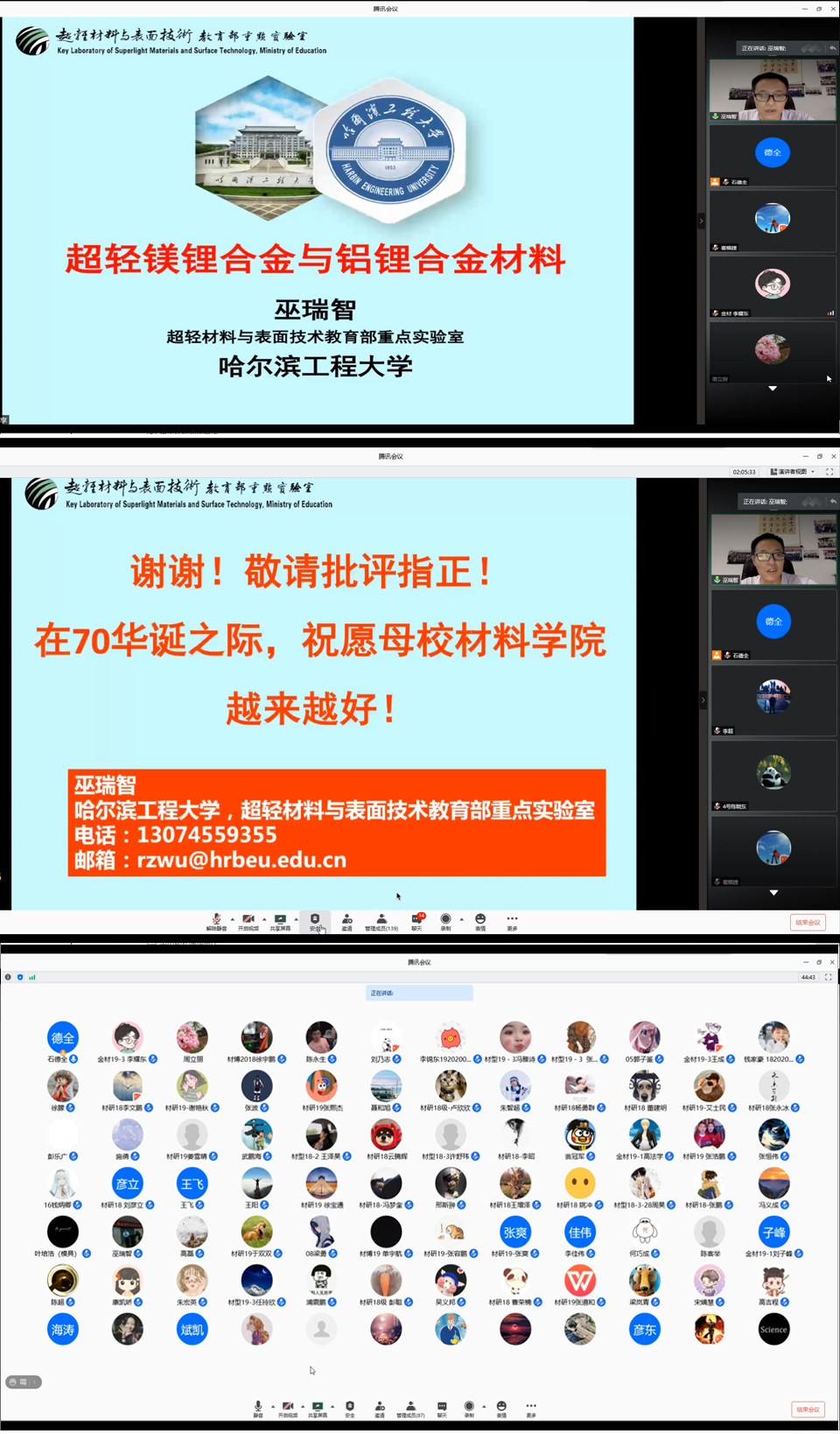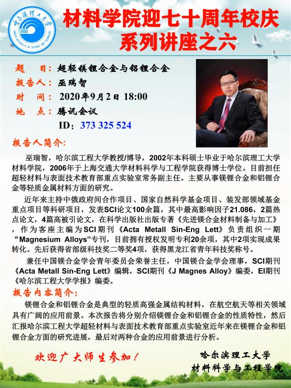 为庆祝学校建校七十周年,材料学院开展迎校庆系列讲座活动。2020年9月2日18时,邀请哈尔滨理工大学材料学院2002届毕业生、超轻材料与表面技术教育部重点实验室常务副主任、哈尔滨工程大学博士生导师巫瑞智教授作为讲座嘉宾,通过腾讯会议线上形式以“超轻镁锂合金与铝锂合金”为题,与我院金属材料和材料成型专业学生、教师以进行了分享和交流,出席在线参会人数达145人。
