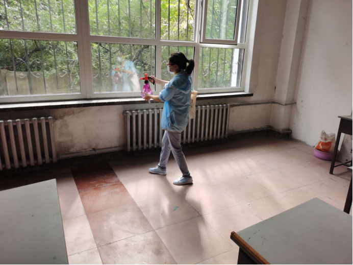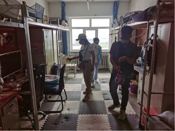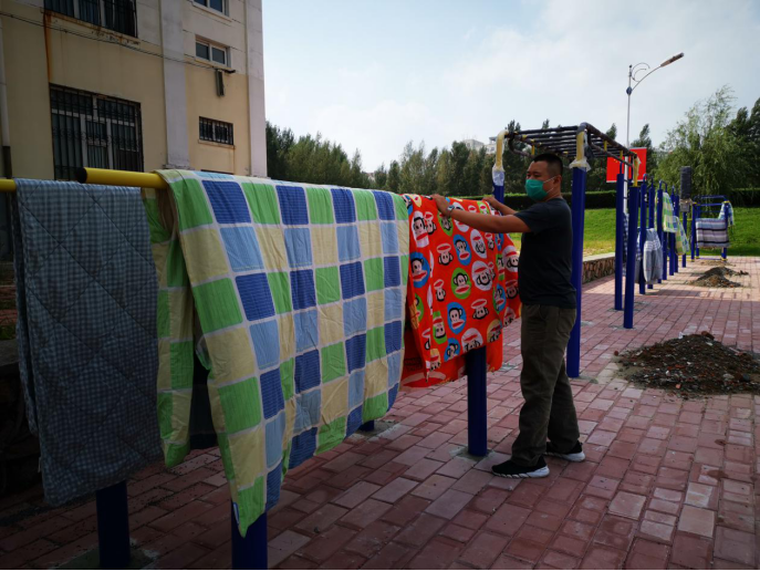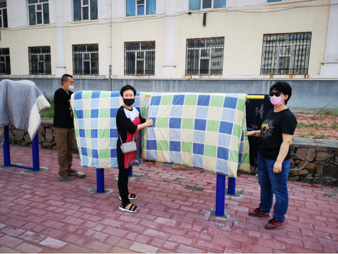 活动连续开展了两天。对学院“闲置”近8个月的学生寝室进行开窗通风;趁着不下雨阳光好的时候,对部分阴面房间里学生的被褥,拿到中心广场体育器材上进行晾晒;对南区四公寓所有学生专教进行通风、消杀;对教室内部分装修垃圾进行了清扫等等。