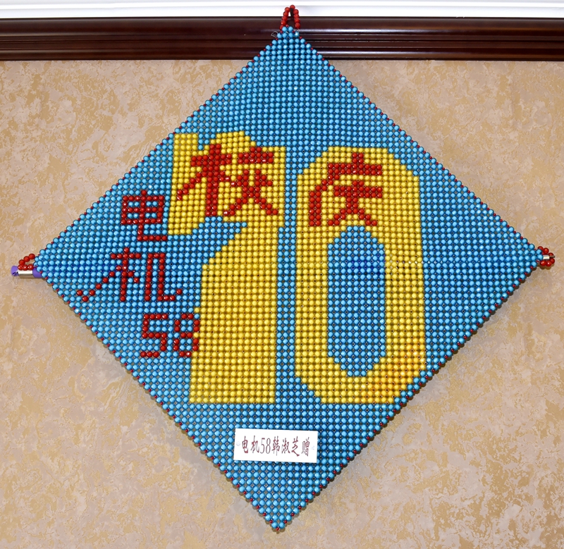 82岁的韩淑芝老校友,1958年8月入电工学院中专部电机专业,学期4年。于1962年8月份毕业后,在哈尔滨电机厂工作至退休。韩淑芝老校友一直情系母校,关注母校的发展。每一次校友举办秩年返校纪念活动她都积极参加。看到母校日新月异的发展变化,老人陪感欣慰和自豪。在母校迎来70华诞之际,为了报答母校对自己的培养之情,尽学子拳拳爱心,老人不顾年迈体弱的身体状态,克服重重困难,自己精心设计了纪念校庆艺术品挂件,从设计选图到选择制作材料都做了精心准备。购置选材行动不方便,就派孩子四处购买。每天投入大量的时间和精力精心制作,第一件作品完成后,老人不满意,便又在此基础上对作品进行了修改和完善,直到满意为止。老人历经近半年的时间,用几千颗珠子和丝线制作了标有“校庆—70电机58”艺术品挂件,献给母校。