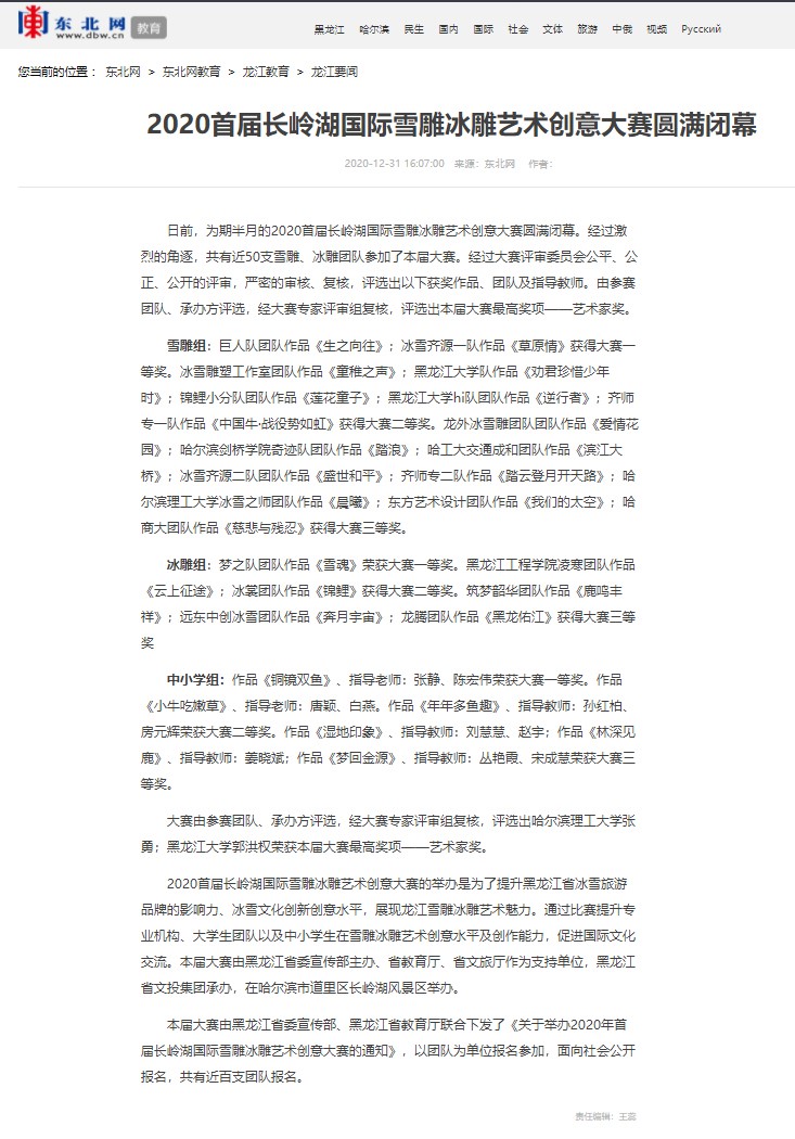 2020年12月31日,2020首届长岭湖国际雪雕冰雕艺术创意大赛落下帷幕,我院建筑学系张勇老师荣获本届大赛最高奖项:艺术家奖,其所带团队《生之向往》参赛作品获得大赛一等奖。