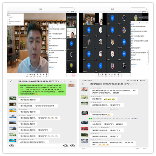 在疫情防控的特殊时期,理学院院“云家访、云就业”活动搭起了家校沟通、师生对话的平台,消除了学生的担忧、家长的顾虑,为学生成长成才“护航”,受到了学生、家长们的认可和肯定。材物17-2班周之岱的爸爸在家访中表示:“感谢理学院开展这次“云就业、云家访”活动,感谢老师的精心准备和详细的讲解,此次家访活动不仅是让我们家长了解了目前的就业形势,更为我们家长朋友指明了接下来努力的方向,希望今后能与学校保持密切的联系与沟通”。统计17-1班韦耀耀家长说:“感谢学院的这次云家访、云就业活动,感谢老师对孩子的关心与教育”。应物18-2班张文惠家长会后发朋友圈说:“听课的主体可以是学生也可以是家长,今天有幸参加理学院辅导员老师云家访,探讨学生共享问题,真的是受益匪浅”。应物18-1班袁志豪家长说:“平时关注孩子们的时候很少,辅导员老师家访中讲的框架清晰,精辟透彻,深入浅出,条理清晰,孩子们能得此良师益友幸甚至哉,感谢老师,感谢学校”。还有很多家长反馈说:“此次“云家访、云就业”活动,不仅让家长与学校走的更近,对学生了解的更多,更有助于家长与学校肩并肩,同心同力完成对学生的培养,利于学生成长成才”。