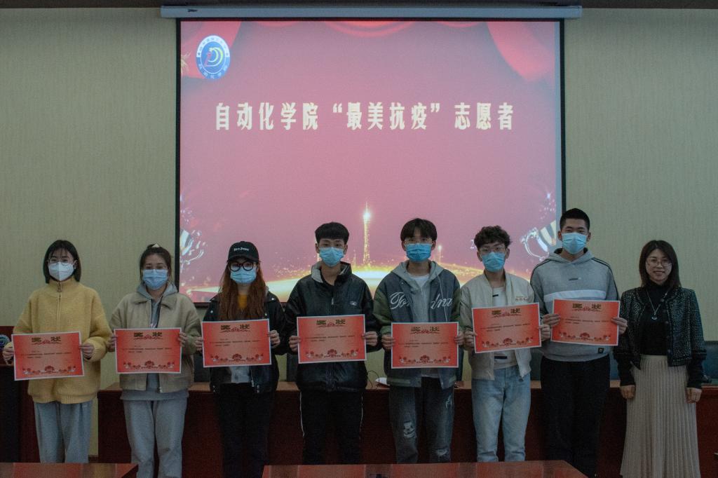 随后,党委副书记艾荻、团委书记黄林萱、19级机器人专业辅导员张戈、19级自动化专业辅导员谢桂花、自动化学生会指导教师付宇为“最美抗疫”志愿者颁发了战疫志愿者证书,并合影留念。