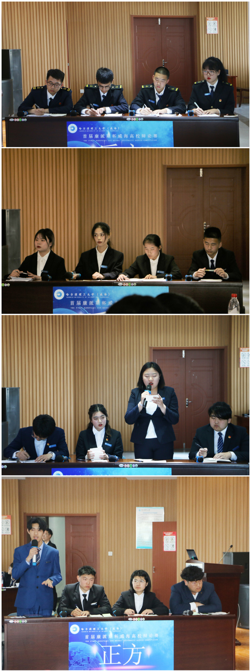 首先,孙晶老师致开幕辞。随后,比赛正式开始。本次比赛有山东大学(威海)、哈尔滨工业大学(威海)、北京交通大学(威海)、哈尔滨理工大学荣成学院、山东交通学院、山东外事职业大学、威海职业学院、威海海洋职业学院等八所驻威院校参加,分为初赛、复赛、决赛三个环节。八支代表队抽签决定对战的正反方,比赛获胜者晋级,落败者直接淘汰。上午的初赛阶段各参赛队伍围绕人与自然的和谐相处、人文情感、自媒体等辩题展开了激烈辩论,选手们展现了优秀的思辨能力及从容镇定的状态。辩论场上涌现出许多“铁齿铜牙”,正反双方引经据典,你来我往,各参赛团队表现出良好的竞技状态和专业水平。经过一番唇枪舌剑,哈尔滨工业大学(威海)、山东大学(威海)、哈尔滨理工大学荣成学院、威海职业学院四支参赛队伍胜出,进入下午的复赛环节。