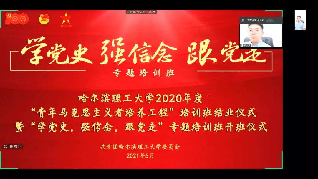 为引导青年学生进一步坚定理想信念,全面提升大学生骨干的综合素质,我校团委积极响应团中央、团省委和学校党委的号召,以建党100年为契机,以加深学员对党史的了解与认识,学深悟透习近平新时代中国特色社会主义思想,掌握马克思主义的思想方法和工作方法,进一步坚定跟党走中国特色社会主义道路的信心和决心为出发点,按照疫情防控要求,于2021年5月21日(星期六)17时借助腾讯会议app线上召开了哈尔滨理工大学2020年度“青年马克思主义者培养工程”培训班结业式暨“学党史,强信念,跟党走”专题培训班开班仪式。2020年度“青马工程”培训班优秀学员代表、“学党史、强信念、跟党走”专题培训班学员及校青年发展规划中心工作人员等近150人参加本次活动,仪式由本次“青马工程”专题培训班副班主任吕懿超老师主持。