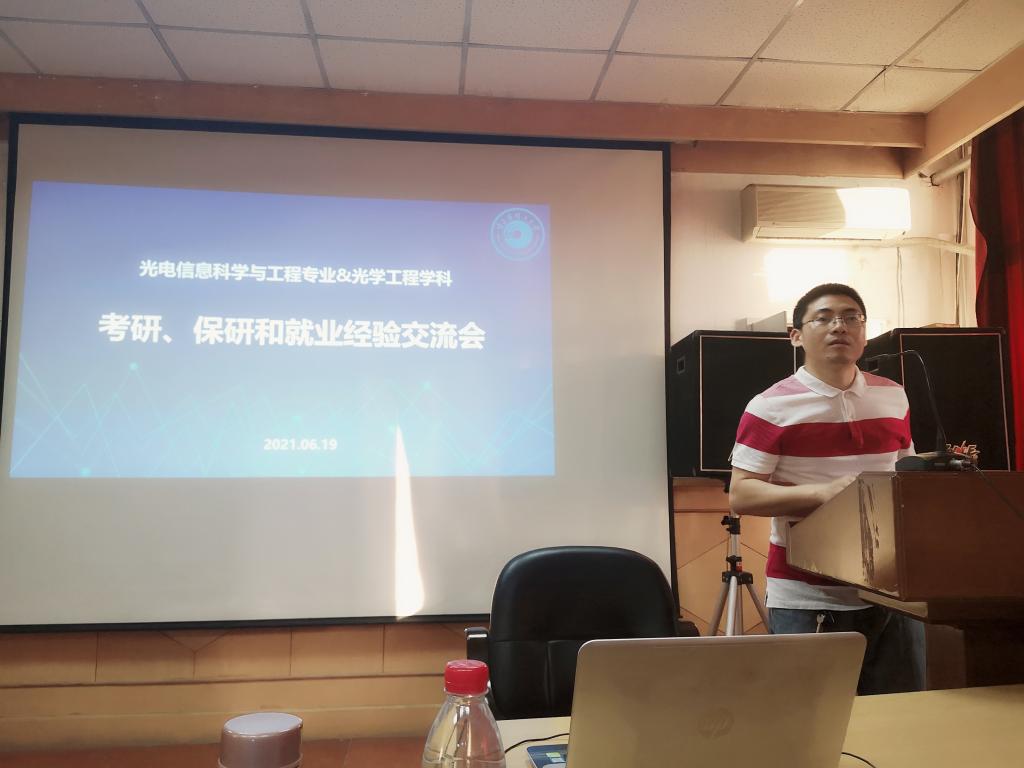经验交流会于晚上6:30召开,首先由吴海滨院长发言,吴院长分析了学院2021年考研和就业情况,对光电专业考研和就业取得的成绩给予了充分肯定,鼓励同学们积极报考本校研究生、积极就业,学院将大力支持光电专业和光学工程学科的建设和发展,并祝愿光电专业在考研和就业方面取得更加辉煌的成绩。光电专业副主任浦绍质老师介绍了光电专业2017级本科生考研和就业情况。光电2017级同学考研和就业取得了较好成绩,其中18人顺利进入理想学府攻读硕士学位,1人出国攻读硕士学位,1人考取公务员,2人参军报效祖国,22人就业,并进入理想企业从事光电相关工作。