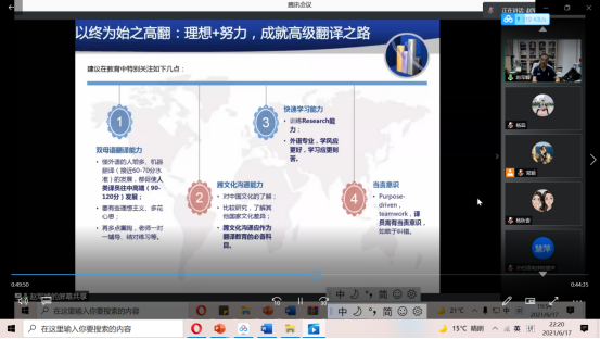讲座人简介:赵军峰,法律语言学博士,现任广东省普通高校人文社科重点研究基地、广东外语外贸大学翻译学研究中心主任,高级翻译学院教授,博士生导师。第三届全国翻译专业学位研究生教育指导委员会委员兼秘书长,中国翻译协会理事兼法律翻译委员会副主任,世界翻译教育联盟副理事长,广东省翻译协会副会长兼法律翻译委员会主任,中国法律英语教学与测试研究会副会长。2008年起负责全国翻译专业学位研究生教指委和教育部高等学校翻译专业教学协作组秘书处日常工作,主持国家社科及省部级科研教学项目多项。主要科研成果:专著《法律语篇信息结构及语言实现研究》(科学出版社,2011);主编Translation Education (Springer,2020);主编MTI教材《商务口译》(外研社,2009);主编“‘十一五’国家级规划教材”《商务英语口译》(第二版)(高教社,2009);主编“‘十五’国家级规划教材”《商务英语口译》(高教社,2003)等;另有译著From the Rule by Law to the Rule of Law: the Path to Law-based Educational Governance in China (Peter Lang 2021,forthcoming)、《法律翻译新探》(高教社,2017)、《我的书店》(译林出版社,2017)等多部。在外语类核心期刊《中国翻译》《外语教学与研究》《外国语》《中国外语》《上海翻译》《外语教学》等发表论文40多篇。