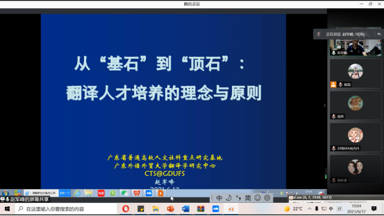 为向建党100周年献礼,不断提升翻译专业学位硕士(MTI)人才培养质量,在学校研究生部大力支持下,外国语学院MTI教育中心于6月17日晚7点如期举办2021年第一期教学讲座。中心聘请全国翻译专业学位研究生教育指导委员会委员兼秘书长赵军峰教授进行主题为《从“基石”到“顶石”:翻译人才培养的理念与原则》的讲座。外国语学院副院长杨蕊主持讲座,学院师生近100人参加学习。讲座通过腾讯会议平台进行。