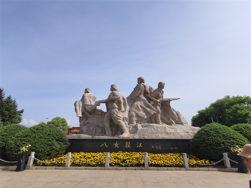 7月3日下午,实践团成员来到位于牡丹江市江滨公园的八女投江纪念雕像前,回望抗战历史,缅怀革命英烈,汲取精神力量。站在这硕大的群雕前,实践团成员思维翻滚,心潮澎湃,当年八女视死如归,英勇战斗的情景又呈现在面前,她们年轻而略显稚嫩的脸庞上带着英勇无畏,让人肃然起敬。