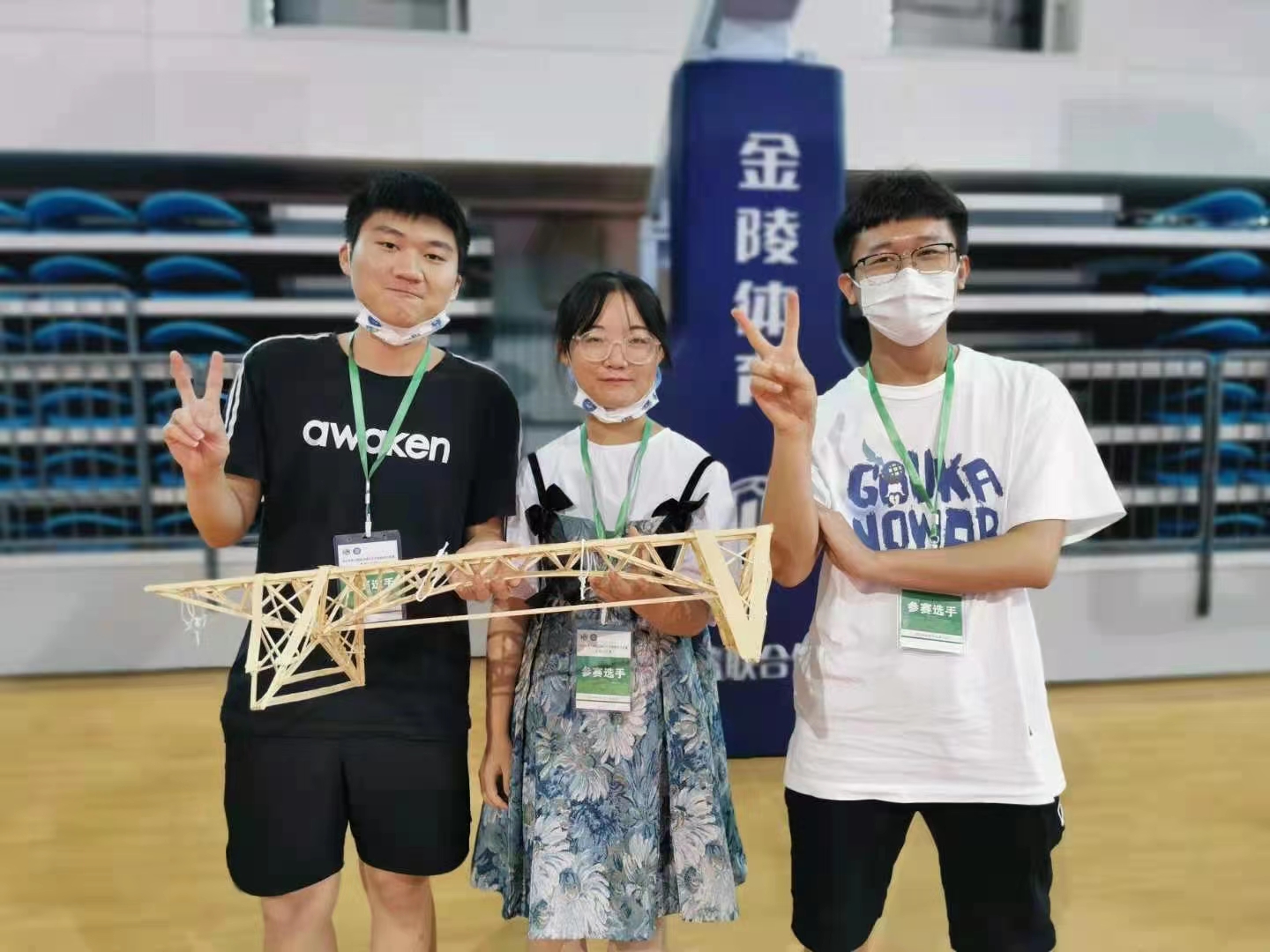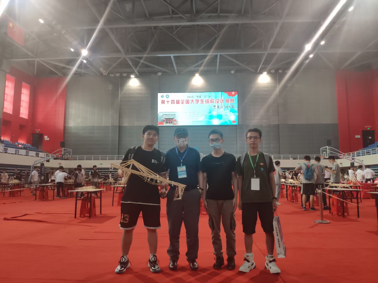 在工程力学系周新伟、隗喜斌、严实三位老师的精心组织和认真辅导下,工力18-1班岳磊、何汶谦、王鑫三位同学组成的飞跃队在第十四届全国大学生结构设计竞赛黑龙江分区赛荣获省级三等奖。师生们在缺少加载设备、模型制作材料自费购买的困难条件下,战高温,克服重重困难,精心设计,取得了优异成绩。