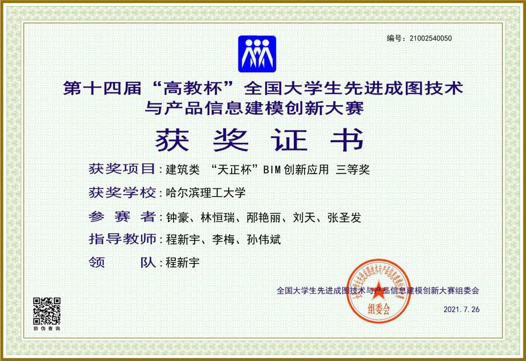 在建筑学系指导教师程新宇、李梅、孙伟斌老师的精心组织和认真辅导下,历经校赛选拔、省赛预选历练,在7月24-26日第十四届“高教杯”全国大学生先进成图技术与产品信息建模创新大赛大赛中脱颖而出,取得了建筑组团体二等奖、建筑类BIM创新应用团体三等奖,张圣发、苏娜、边浬恺等3名同学取得个人全能二等奖,林恒瑞、邴艳丽、郭东、钟豪、刘天、王子佳等6名同学取得个人全能三等奖,所有参赛同学全部获奖。
