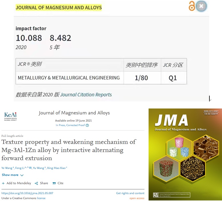 近日,我校材料科学与化学工程学院(简称材化学院)博士研究生王野在国际期刊《Journal of Magnesium and Alloys》上发表了题为“Texture property and weakening mechanism of Mg-3Al-1Zn alloy by interactive alternating forward extrusion”(已在线出版,DOI:https://doi.org/10.1016/j.jma.2021.05.007)的学术论文,王野为第一作者,李峰教授为通讯作者,我校为第一完成单位。