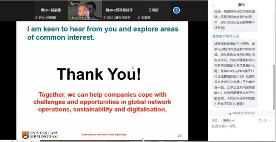 报告会在与会教师和学生们的热烈感谢中结束。张教授丝丝入扣的分析、旁征博引的论证和高屋建瓴的观点让大家对数字化创新有了切实的理解,对科学研究有了更深切的感悟。此次学术报告会取得圆满成功。