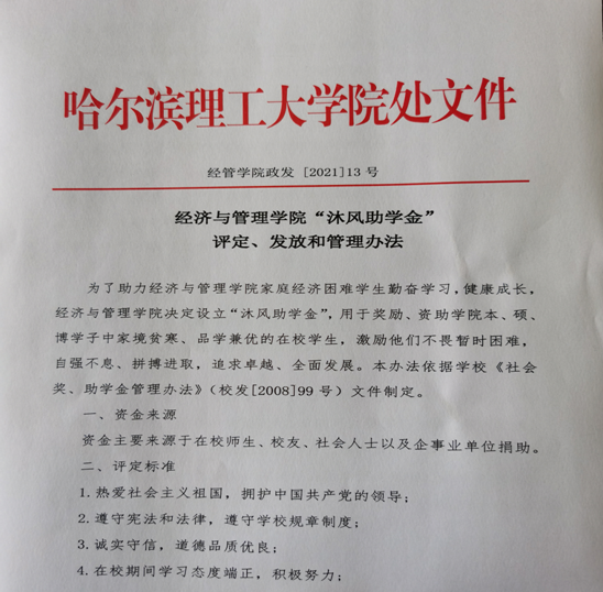 为了助力经济与管理学院家庭经济困难学生勤奋学习,健康成长,经济与管理学院日前设立“沐风助学金”,旨在用于奖励、资助学院本、硕、博学子中家境贫寒、品学兼优的在校学生,激励他们不畏暂时困难,自强不息、拼搏进取,追求卓越、全面发展。十年树木,百年树人。沐,有润泽、培育的含义。风,指经历风浪的人,即这些心怀梦想、坚韧不拔的寒门学子。“沐风”二字合起来寓意就是让困难学生得到资助,使他们更加顽强成长成才。