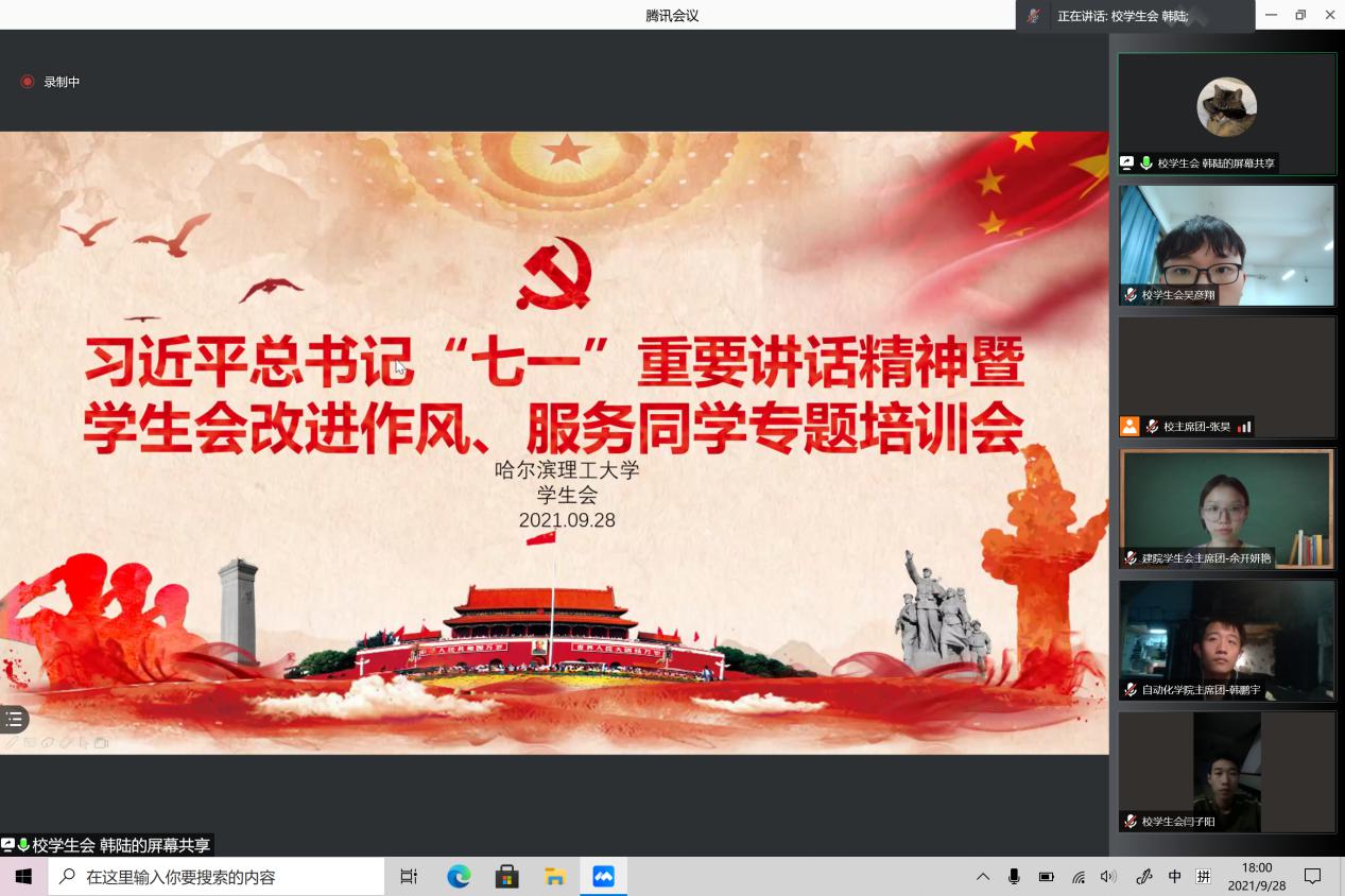 9月28日18点,我校学生会线上召开了学习习近平总书记“七一”重要讲话精神暨学生会改进作风、服务同学专题培训会,校团委学生会指导教师李晟睿,各学院学生会主席团成员以及校学生会全体成员参加培训。会议由校学生会综合办公室韩陆主持。