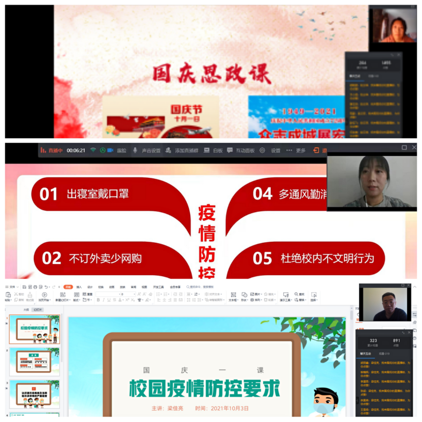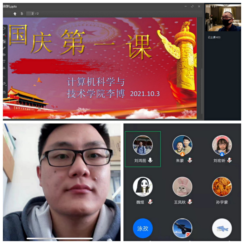 为上好国庆第一课,学院各年级辅导员老师集中备课,全体同学共同积极参与。按照学校国庆第一课主题活动安排,各位辅导员老师精心组织、用心用情讲授。一是带着道理和感情讲。在国庆第一课上,把本轮疫情发生在家门口,“德尔塔”病毒传染性强、潜伏期长,学校上万人密集居住一旦出现疫情后果不堪设想的道理向学生讲清楚,把配合防疫工作就是爱校如家的具体表现,凝聚广大学生的感情共识;二是面向学生实际需求讲。各位辅导员老师侧重从学校“静态管理”下的心理调适、如何聚焦学习主业、毕业生线上就业发动、考研学生备考等学生切身需求进行指导和帮助。三是努力构建家校合力抗疫。各位辅导员老师给全体学生发布《齐心协力 共抗疫情---致计算机学院全体学生的一封信》的同时,也在家长群中同步开展学校防疫形势及工作的介绍,取得家长理解和支持,形成家校合力,抗击疫情。