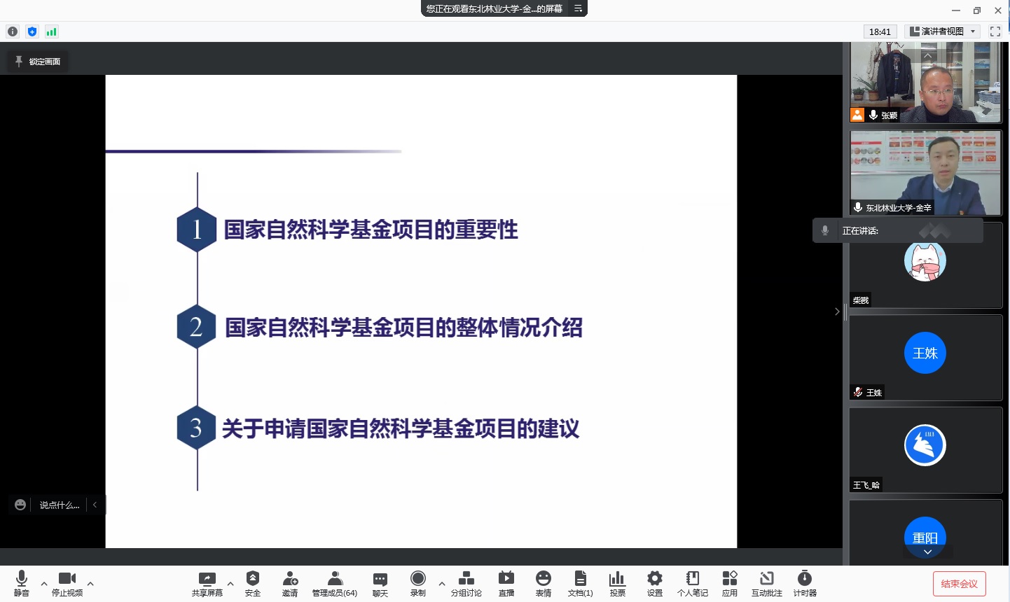 为了切实做好学院2022年度国家自然科学基金申报工作,及时把握基金动态,准确掌握政策导向,进一步提升申请书撰写质量,11月9日中午,理学院召开国家自然科学基金项目政策形势宣讲及申报经验交流线上会议。东北林业大学科学技术研究院副院长金辛应邀参会并作专题报告,理学院物理教学与实验中心教师刘欣作经验分享。院长宋清昆出席会议,研究生导师、青年教师与研究生代表共同聆听。会议由副院长张颖主持。