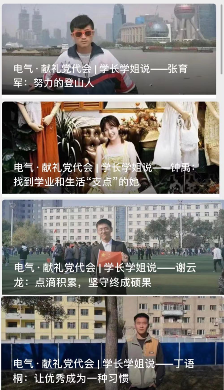 榜样是一种向上的力量,具有极强的感染力,学院开展“朋辈育人促学习、榜样力量助成长”为主题的优秀学生经验交流报告,用学生身边的榜样事迹感染和教育学生。依托学院官方公众号,推出“学长学姐说”,以系列报道的形式呈现国家奖学金获得者、保研同学、竞赛大神等不同类型优秀学生获得的成绩和成功经验,预计通过18名优秀学生的事迹以具体的人和事,激发学生的情感认同,以朋辈力量帮助低年级学生规划学业,制定目标、理清学习路径,以积极向上的良好学风向党代会献礼。