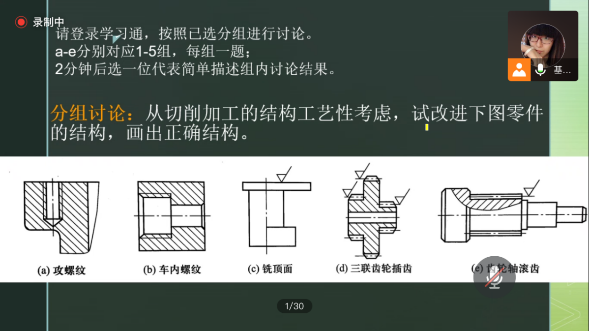 本节课教学过程包括概念引出、知识点讲解、示例分析、分组讨论与课后任务布置等环节。利用网络教学平台发布自主学习任务书、MOOC形式的教学视频等相关资料。学生需在课前完成线上对应章节的任务点。通过调查问卷形式获取学生较难理解的知识点,然后有针对性地进行讲解。课上,利用教学平台对典型零件在攻螺纹、车内螺纹、铣顶面等加工过程中的结构工艺性发起讨论。自由组建学习小组,共同完成讨论任务,通过观点流通的方式提升合作沟通能力;利用组内、组间互评方式查缺补漏,弥补对各知识环节学习的不足。利用主题讨论、抢答、随机选人、腾讯会议交流等多途径与学生进行互动,课堂气氛活跃。刘老师积极引导学生广泛参与,通过翻转课堂的形式培养自主学习的能力。课后,发布主题讨论进阶训练,提高学生自主学习的能力。