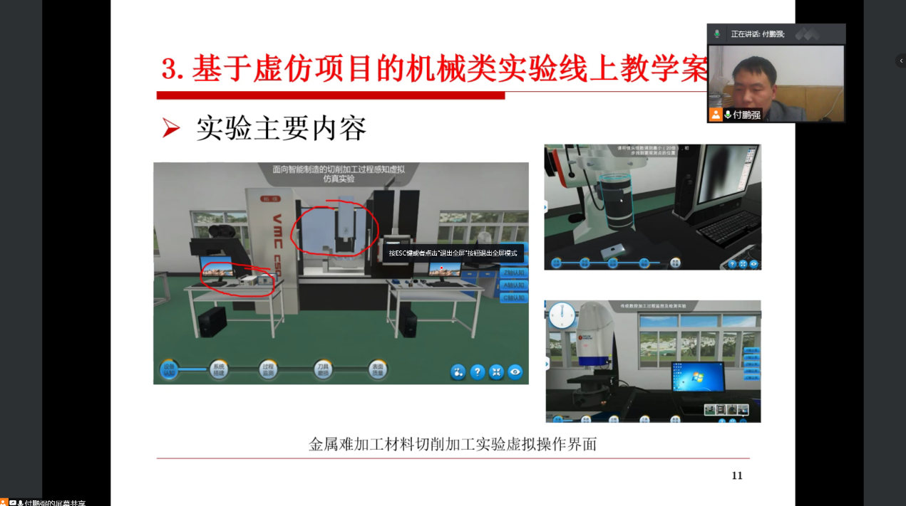 示范观摩课后付鹏强老师以“基于虚仿项目的机械类实验线上教学案例分享”为题,主要从虚拟仿真实验教学项目建设背景及建设情况、基于虚仿项目的机械类实验线上教学案例、虚仿实验存在的问题及线上实验面临的机遇与挑战等方面进行了分享。疫情防控等应急状态已成为新常态,大数据、信息化、互联网等新技术的发展已成为新时代的重要特征,开发虚拟仿真实验,是开展线上实验教学面临新的机遇与挑战。基于此,付鹏强老师指出虚仿实验要因地制宜,挖掘特色,按需开发。