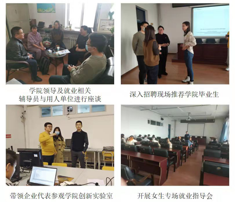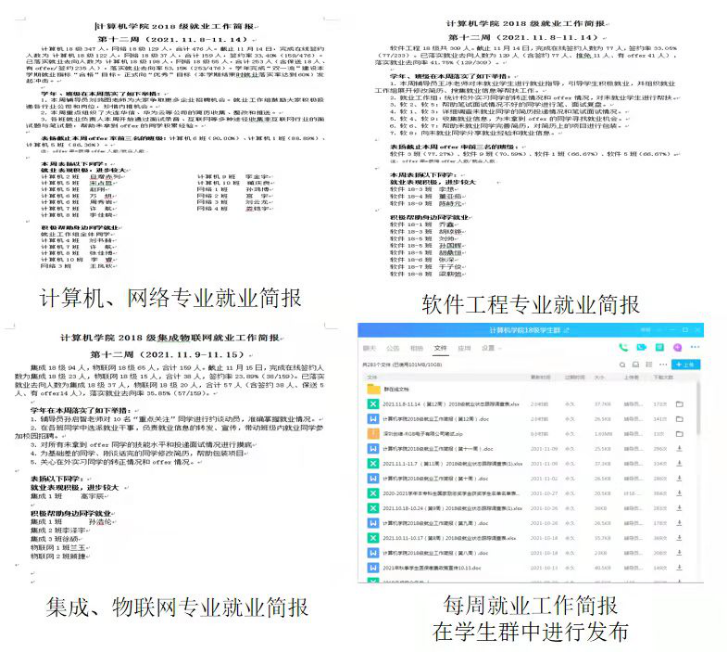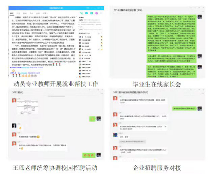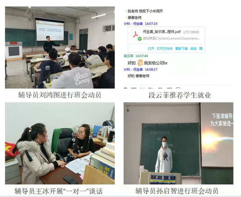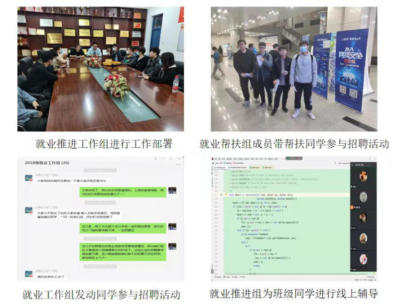 毕业学年开展多种举措推进就业工作:自第8教学周开始,毕业学年每周发布《2018级就业工作简报》,对过去一周的就业情况进行总结,展示各班好的做法,对积极帮助身边同学就业和就业表现积极、有较大进步的同学给予表扬,营造浓厚的就业氛围。院团委组建企业入校招聘服务组,为每家到院招聘企业提供全过程的“一对一”服务。计算机、网络专业动员保送同学组建“408”工作组,“一人一班”,为考研学生专业课复习搜集资料,提供专业课答疑服务;组建学年就业工作推进组,具体开展就业相关工作,浓厚学年就业氛围。各班组建就业帮扶组,在简历制作、笔试面试准备提供帮助,带动组内同学参与招聘活动。毕业班辅导员召开线上毕业生家长会,向家长说明及时就业关乎学生能否实现从“校园人”向“社会人”的转变,关乎学生本人未来发展和家庭幸福,家校合力督促毕业生参与招聘活动。