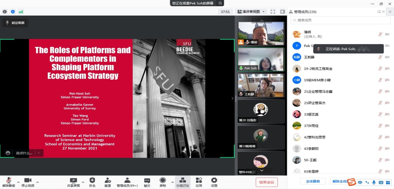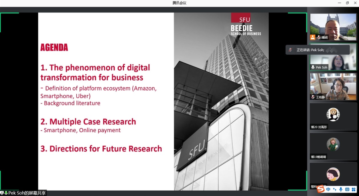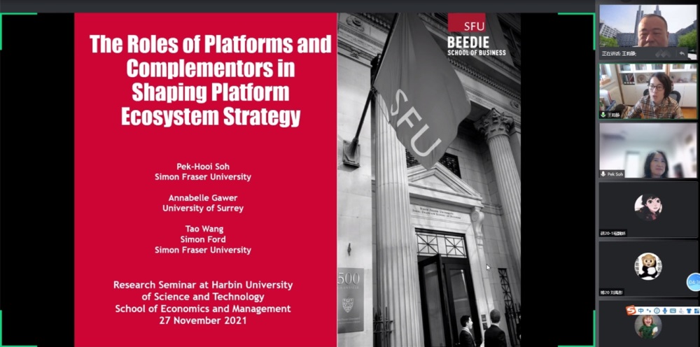 为促进我校师生了解平台生态系统研究前沿,加强学术交流,2021年11月27日上午,经济与管理学院邀请加拿大西蒙弗雷泽大学Pek Hooi Soh教授作了题为“平台生态战略:平台和互补者的作用(The Roles of Platforms and Complementors in Shaping Platform Ecosystem Strategy)”的学术报告。报告通过腾讯会议线上举行,经济与管理学院副院长王莉静,学院200余名中青年骨干教师、硕博研究生参加了此次学术报告,会议由蒲明教授主持。