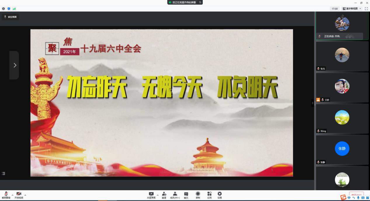 为全面深入学习领会党的十九届六中全会精神,扎实推进学习宣传贯彻工作,持续推动全会精神入脑入心,引导党员干部和师生把思想和行动统一到全会精神上来,落实立德树人根本任务,12月10日上午,自动化学院特邀学校党的十九届六中全会精神宣讲团成员、马克思主义学院教师齐伟老师开展题为“勿忘昨天 无愧今天 不负明天”党的十九届六中全会精神宣讲会。会议由自动化学院党委书记贾红宇主持,学院全体师生党员参加。