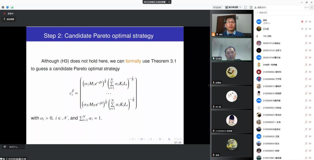 王光臣教授在报告中重点分享了倒向随机微分方程、合作博弈、Pareto最优策略等前沿热点问题。讲述了倒向随机微分方程相较于正向随机微分方程的不同和优势,详细介绍了Pareto最优化的数学含义、研究动机和相关研究工作,对研究倒向随机微分方程的Pareto最优化问题遇到的困难和相应的解决方法进行了简要的讲解,并通过一个金融领域的实例形象地展示了Pareto最优化策略是如何应用和实现的,以及使用Pareto最优化策略可以有效地避免一些投资风险,强调理论基础的重要性和研究问题的严谨性。师生提问互动环节,王光臣教授对指标泛函中指数函数的含义、由倒向随机微分方程驱动的合作博弈优化控制的优势、以及倒向随机微分方程存在解析解的前提条件等问题给出了细致的解答,与会师生受益匪浅。