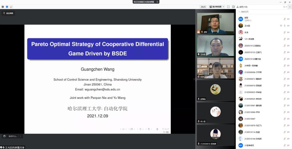 为了促进院校间的学术交流、拓展师生科研思路、提高科研成果质量,应自动化学院胡军院长邀请,山东大学王光臣教授为我校师生作了题为“Pareto optimal strategy of cooperative differential game driven by BSDE”的学术报告。2021年12月9日,在科技处的大力支持下,主题报告会通过腾讯会议线上举行,自动化学院学科带头人、方向带头人及来自相关学院的210余名师生在线参会,报告会由自动化学院院长胡军教授主持。