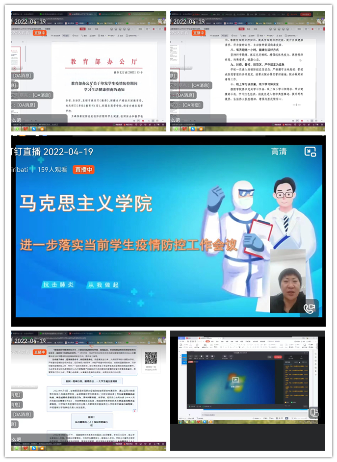 为全面贯彻落实省、市关于新冠肺炎疫情防控最新决策部署,筑牢我校疫情防控安全屏障,4月19日19时,马克思主义学院通过钉钉线上会议形式召开学生疫情防控大会,马克思主义学院全体学生参加会议。本次会议由尹淼老师主持,学院党委副书记陈迪男老师、副处级辅导员刘祥蓉老师参加了会议。