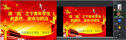 为切实做好疫情防控期间学生的思想引领,增强学生抗击疫情的信心,4月23日晚19:00,马克思主义学院通过钉钉平台为学生上了一堂以“战‘疫’之下青年学生的责任、使命与担当”为主题的思政课,马克思主义学院党委书记肖庆生为同学们倾情讲授,学院党委副书记陈迪男主持会议,全体学生线上参加。