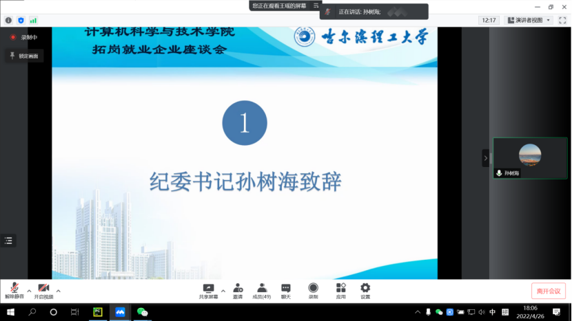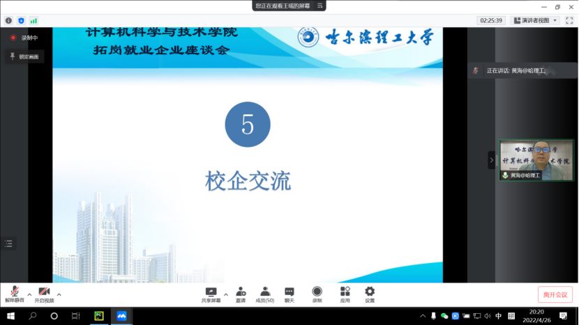 为贯彻落实《黑龙江省高校书记校长访企拓岗促就业专项行动的实施方案》文件精神及省教育厅相关会议工作要求,结合学校关于《哈尔滨理工大学校级领导班子成员访企拓岗促就业专项行动的实施方案》文件精神,为了推进学校与企业之间的交流合作,增进双方交流互信,畅通信息交流渠道,促进学校人才培养,提升学生就业竞争力,促进毕业生充分就业、高质量就业,千方百计开拓更多就业岗位和机会,4月26日晚18时,计算机科学与技术学院通过腾讯会议线上召开了拓岗就业企业座谈会,会议由学院院长黄海主持,学校纪委书记孙树海、学院班子成员、毕业班辅导员、各系主任和29家企业负责人参加了座谈。