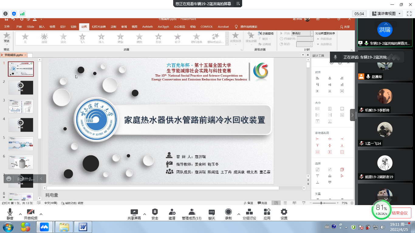 第十五届全国大学生节能减排社会实践与科技竞赛哈尔滨理工大学校内选拔赛由机械动力工程学院承办,于4月25日晚19:00通过腾讯会议成功举办,机械学院副院长姜金刚、竞赛指导教师兼评审教师、全体参赛学生参加了本次活动。比赛筹备阶段,成立了由教学副院长牵头的工作小组,对校赛程序和评审规程进行了精心策划,制定了校内选拔赛实施方案。评审会伊始,副院长姜金刚进行了动员和讲话,强调评审教师要严肃科学的态度,客观公正、实事求是参与评审工作,并签订评审承诺书;全体参赛队伍,严格遵守竞赛规则,并以此次评审为动力,继续完善后续竞赛环节。评审会分两组进行,每组3位评审教师,分别对每个参赛队伍从科学性、创新性和先进性等方面提出了宝贵意见和建议,帮助各支参赛队伍提高作品质量,不断完善作品内容。各组评审教师根据每个参赛队伍的申报书、说明书和现场答辩情况进行打分,并按序确定入围国赛的15项作品。