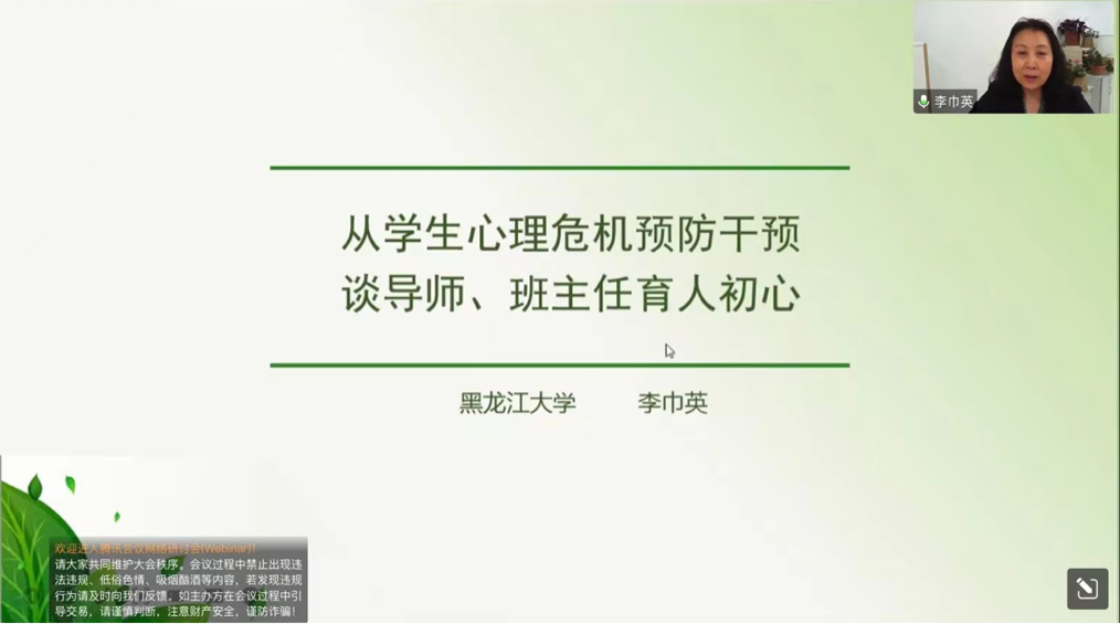 为进一步加强我校心理健康教育工作,全面构建校内协同育人机制,强化学生心理健康教育的全员参与意识,我校于4月29日18时举办主题为“从学生心理危机预防干预谈导师、班主任育人初心”培训会,培训通过腾讯会议平台线上进行。培训会邀请黑龙江大学学生工作处副处长、心理咨询中心主任、黑龙江省高校心理健康教育专家委员会秘书长李巾英教授作为主讲嘉宾。党委学生工作部班子成员、各学院研究生导师、班主任、学生工作副书记、辅导员参加培训,培训由党委学生工作部部长戴湘竹主持。