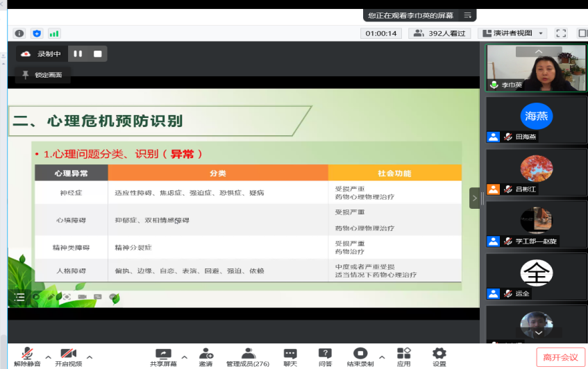 本次培训近300人参加,李巾英教授从高校心理健康教育工作体系介绍入手,深刻分析了高校学生心理问题及心理危机成因,从对心理育人工作理解、心理危机预防识别、心理危机干预策略三个部分阐述。通过丰富的案例生动地讲解了学生各种心理问题的具体表现形式,以危机识别、谈心谈话、导学为主的心理危机干预策略,为我校研究生导师、班主任在处理学生心理危机干预工作提供了有效操作方法和经验启示。最后,戴湘竹指出,心理健康教育工作还需多部门齐抓共管、多角度研判学生心理状态,共同努力将心理育人与高校科研育人、文化育人、管理育人、服务育人等相结合,形成全员、全过程、全方位的育人合力,促进我校心理健康教育工作再上新台阶。