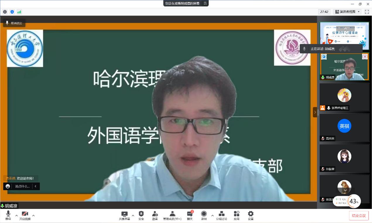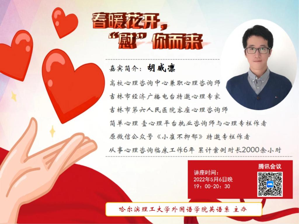 为了提高师生疫情下的心理素质,保障师生身心健康,真正培养“德智双全,身心健康”的有为青年。2022年5月6日,在外国语学院党委的领导下,英语系党支部通过网络平台,邀请了高校心理咨询中心兼职心理咨询师、吉林市经济广播电台特邀心理专家、吉林市第六人民医院客座心理咨询师、《小崔不抑郁》特邀专栏作者胡威凛老师,为英语专业师生开展了一次以“春暖花开,‘慰’你而来”疫情期间专题心理健康讲座。