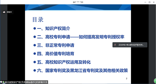 为深入学习贯彻习近平总书记重要讲话精神,落实党中央、国务院和省委省政府关于推进知识产权高质量创造,支撑引领创新驱动发展的工作部署,全面提升学校知识产权创造、运用、保护、管理和服务水平,5月11日下午,科技处组织召开了《高校专利申请及运用实务》专题培训线上会议,邀请黑龙江立超同创知识产权代理有限责任公司总经理、星级专利代理师杨立超老师作专题培训,各学院主管科研工作负责人、科研秘书、相关教师和学生、科技处全体人员等400余人参加了会议。会议由科技处处长康守强主持。