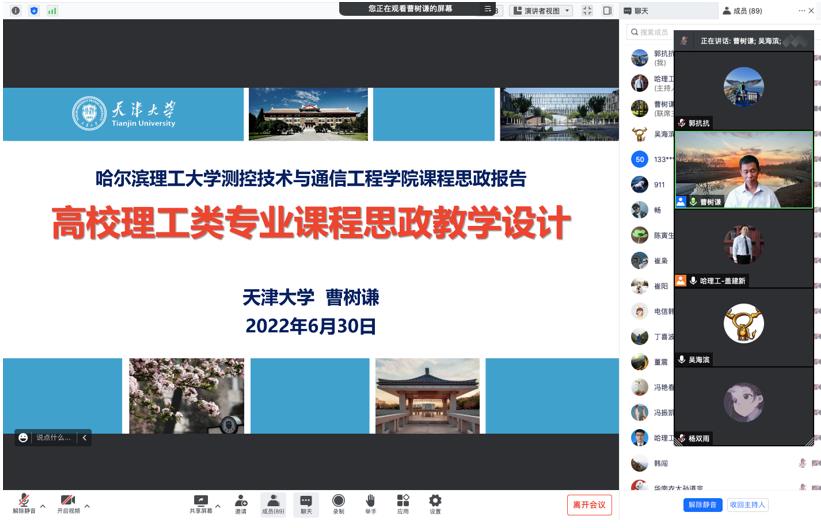 为全面落实立德树人根本任务,推进我院课程思政建设,促进教师课程思政理论认知与实践能力提升,提高课程育人实效,2022年6月30日下午测控技术与通信工程学院特邀天津大学省级教学名师曹树谦教授开展了课程思政专题报告会,报告会采用线上方式进行,由学院教学副院长盖建新主持。报告历时两个小时,吸引了来自测通、机械、电气、计算机等学院130余名教师聆听。