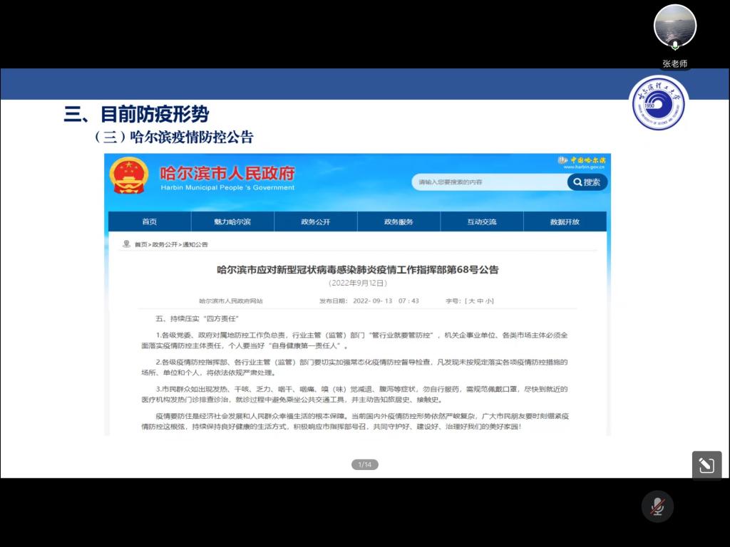 为全面贯彻落实学校新学期疫情防控工作要求,推动校园防控工作科学有序开展,加强新生疫情防控相关知识教育,增强新冠疫情防控风险意识和能力,确保全体新生身体健康和生命安全,根据学校疫情防控需求及工作部署,理学院于9月13日线上召开疫情防控教育专题讲座。会议由学校办公室副主任张浩男主讲,2022级全体新生、在校各年级班长、团支书线上参会,理学院党委副书记宋广军参加会议,会议由新生辅导员孙国宇主持。