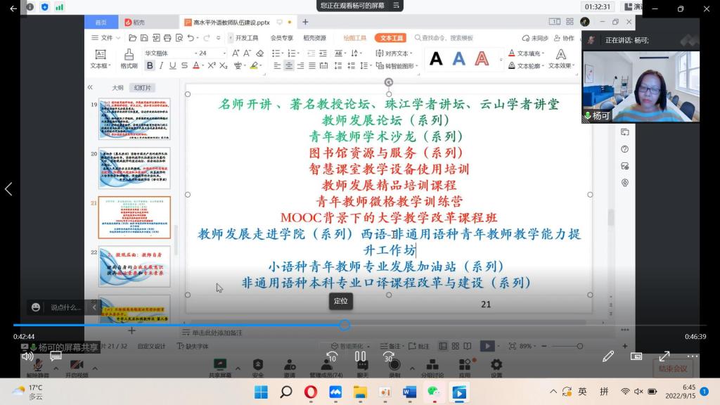 9月14日18时,为持续提升导师育人和指导能力,不断提升研究生培养质量,在学校研究生处指导下,外国语学院成功举办硕士研究生导师培训系列讲座。学院邀请广东外语外贸大学杨可教授,做主题为《高水平外语教师队伍建设实践与思考》的讲座。院长马艳辉、全院硕士研究生导师等70余人参加学习,副院长杨蕊主持讲座。