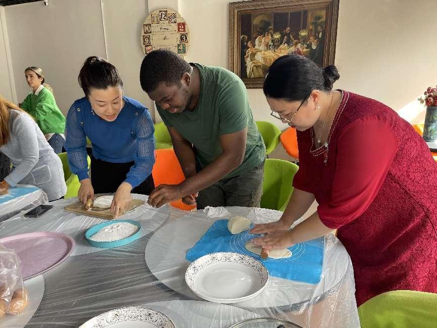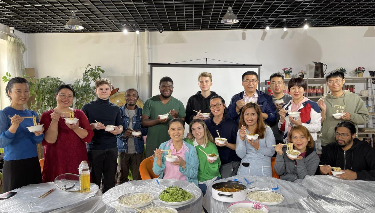 中午12点半,通过和面、揉面、搓面、擀面、切面……不一会儿,一碗碗热气腾腾、香喷喷的面条被端了上来,浇上留学生亲手制作具有东北特色的鸡蛋酱、拌上黄瓜丝。大家共同享用自己的劳动成果,纷纷称赞“国庆面好香”。俄罗斯籍留学生尼基塔:“这面太好吃了,我吃了五碗。”