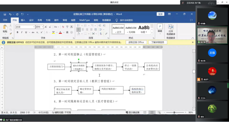 首先,孙广路代表学院党委对学院全体教师在疫情期间坚守本职,在党建工作、人才培养、科学研究及学院双一流建设等方面做出贡献表示感谢。随后,孙广路传达了学校党委对疫情防控工作的最新要求,从第一阶段(黄金1小时阶段)至第四阶段(有序解封阶段)详细解读了《哈尔滨理工大学疫情应急处置操作手册》,并从学院层面细化讲解了学院疫情防控组织机构和学院疫情应急处置方案。