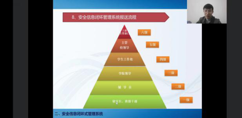 会议开始,石金永老师就培训的主要目的及重要意义向大家进行了说明,强调了学生安全信息员队伍建设在校园安全工作中的必要性和重要性。主要从高校学生安全稳定面临的形势、安全信息闭环式管理系统介绍、安全信息闭环式管理系统发挥的作用三个方面进行了讲解,使信息员明确的了解了影响学校安全的因素,时刻保持警惕,并提示各位信息员要严格按照工作细则提示进行日常管理工作。此外,石金永老师还对施行安全信息闭环管理系统应掌握的相关电话、涉及内容、报送形式、报送原则、报送机制、报送流程和如何进行信息研判进行了详细讲解,使安全信息员掌握了安全闭环系统的相关内容、明确了自己的职责、掌握了危机事件处理程序,在发生安全问题时能迅速、准确的按照程序进行上报,真正当好辅导员的“千里眼”“顺风耳”,为学生宿舍的安全问题保驾护航。