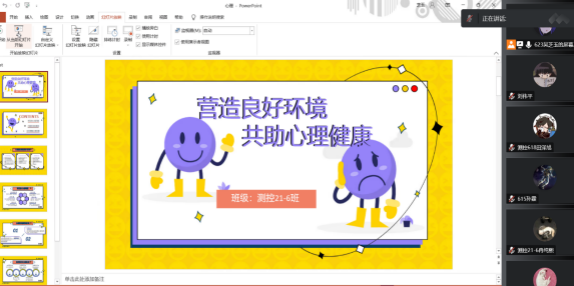 测通学院四个年级共82个班级分别组织开展了主题班会活动。根据疫情防控要求,班会采取了线上、线下结合的方式,由班长和心理委员主持,各班级班主任、辅导员均已参会。班会围绕着促进大学生对心理健康的自我关注意识和自我调节能力、提升大学生心理素质、积极面对疫情等方面开展了学习和讨论,为大学生健康成长和心理健康的发展奠定了坚实基础。