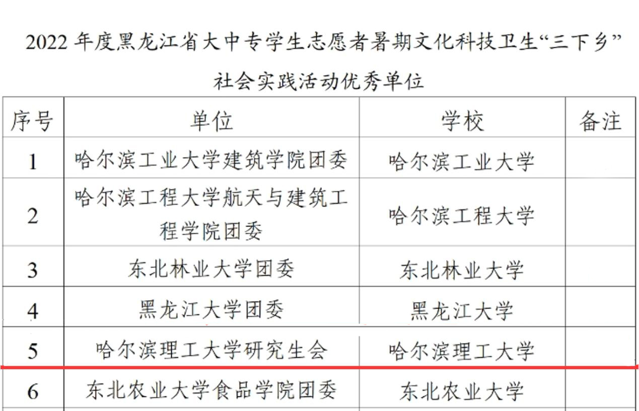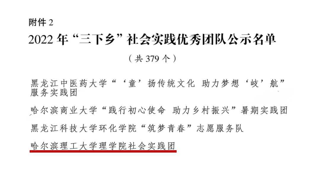 近日,团中央和团省委分别对2022年大中专学生志愿者暑期文化科技卫生“三下乡”社会实践活动中表现突出的先进集体及个人进行了总结表彰,我校喜获多项国家级、省级表彰。其中,理学院社会实践团被评为全国“2022年度‘三下乡’社会实践活动优秀团队”、校研究生会被评为“2022年度黑龙江省‘三下乡’社会实践活动优秀单位”、理学院社会实践团被评为“2022年度黑龙江省‘三下乡’社会实践活动优秀团队”、我校教师李晟睿同志被评为“2022年度黑龙江省‘三下乡’社会实践活动优秀个人”。